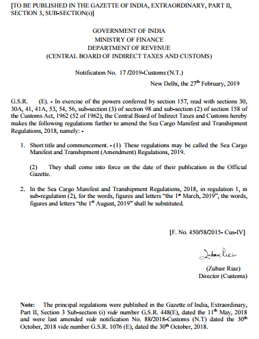 - 一旦舱单数据发送给海关,任何更改申请都需要经海关核查批准,对于更改收货人或通知方的申请,原收货人需要提供给海关一个"无异议"证明。