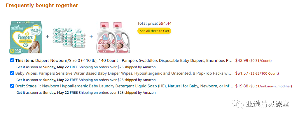 在商品页面的"经常性一揽子购买"推荐中,亚马逊通过购物者过去购买了什么、他们在购买产品时看到了什么、他们的购物车中有哪些商品等大数据,向潜在用户列出了推荐的一起购买的商品建议,而这些建议的成功率高达60%。下图的"Frequently bought together",亚马逊向购买帮宝适的用户推荐了经常性购买的一揽子商品:婴儿湿巾和婴儿洗衣液,让客单价从43美金变成了94美金。
