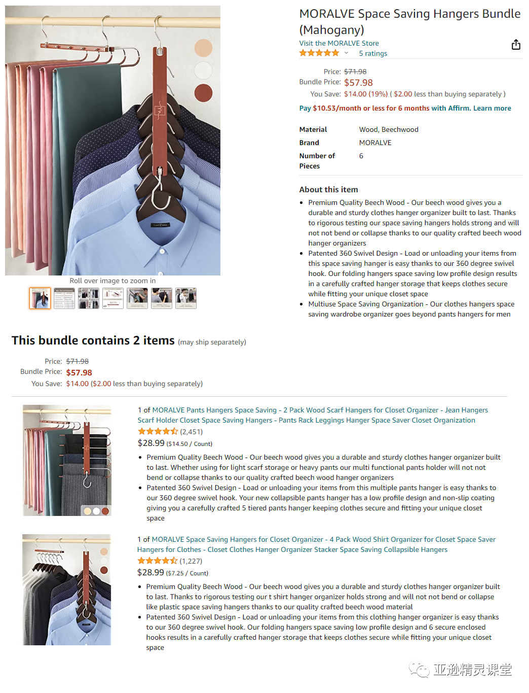 1、功能相似的商品进行捆绑:用户购买A商品的时候,有可能对其它功能相似的B商品也感兴趣。这种捆绑的特点是商品的价格很接近,因此如果策略一旦奏效卖家无异于将客单价提高了一倍或者几倍。下图示例,卖家将销售围巾的挂架和衬衣的衣架进行了捆绑,捆绑之后的价格比单独购买的价格优惠了2美金。