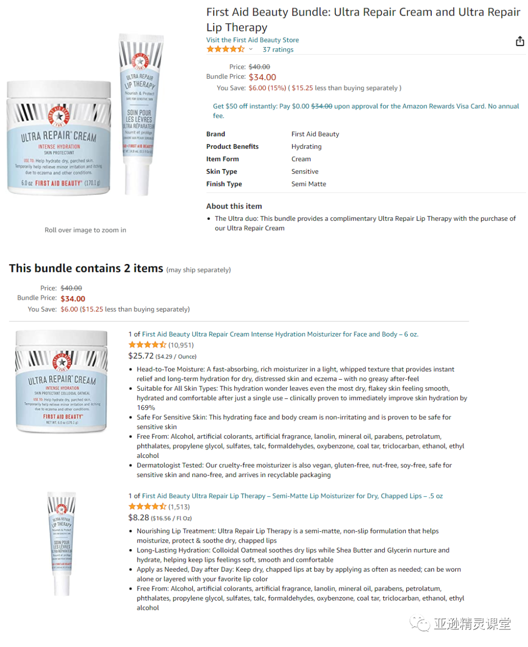 2、功能不同的商品进行捆绑:用户购买A商品的同时,可能对其它功能的B商品也感兴趣。这种捆绑满足了用户对一个领域不同功能商品的需求。通常情况下将一个主力产品和价格相对较低的产品搭配更容易激发用户购买的欲望。也可以使用此方法来推动新品的销售。下图示例,用户将修复霜和唇膏捆绑,让用户捆绑购买时比单独购买节约了12.25美金。