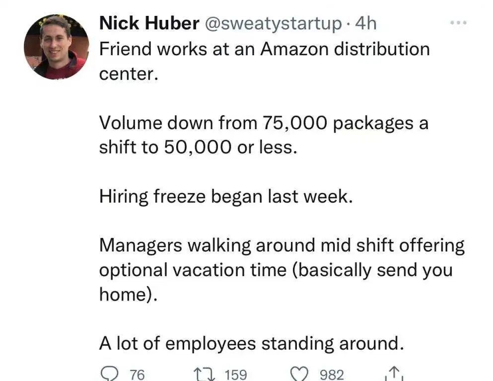 2022以来,亚马逊的营收增速较之前有所放缓,其中因大肆扩张基础设施建设而导致的产能过剩,为其带来了100亿美元的额外成本使得其盈利前景疲软。 而除此之外,近日据推上爆料,某亚马逊仓库员工反映亚马逊销量从75000下降到50000甚至更少,并且招聘从上周开始中止,许多员工无所事事甚至能任意选择休假时间。