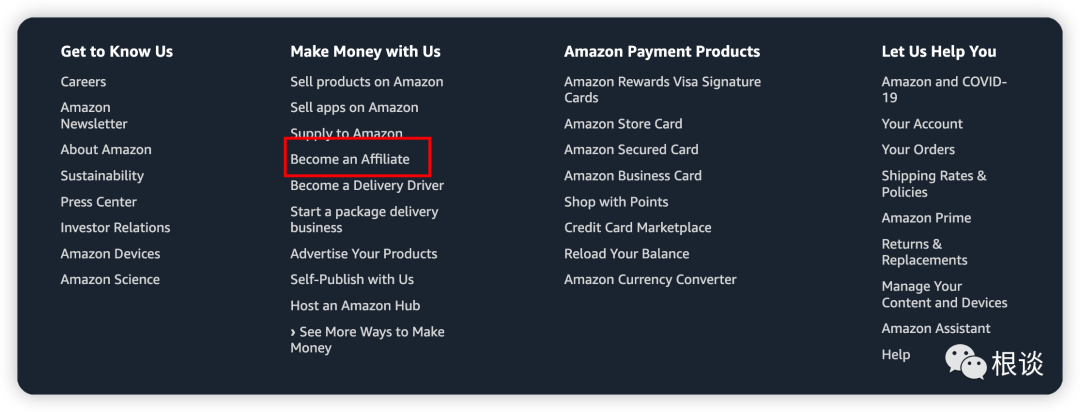 后来很多在线电商独立站相继模仿开展属于自己的联盟营销计划,目前亚马逊联盟营销计划属于站外引流的一部分,大家可以在Amazon网站底部可以找到,可见其重要性。