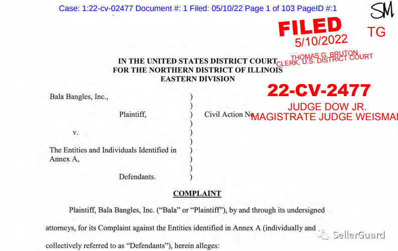 据美国法院官网资料,我们关注到Bala Bangles 健身腕带这款产品近期再次立案维权。该产品最早在去年9月份隐匿立案起诉,10月中旬有部分卖家收到了冻结,案件编号:21-cv-5051。如今再度立案维权,并且这次冻结了很多卖家的店铺,名单显示一共有382家店铺被告。以下是具体的案情和被告信息。