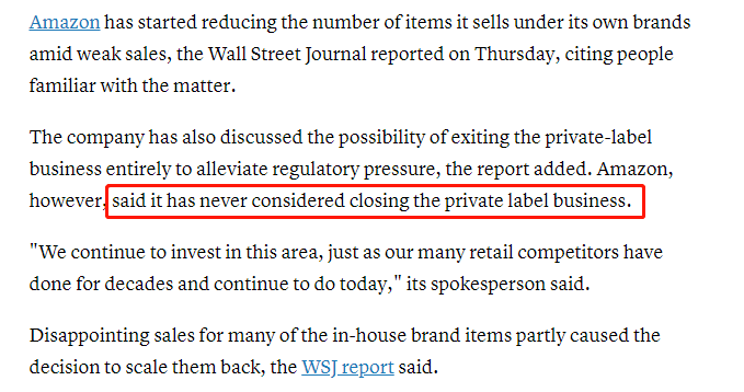 亚马逊一位发言人表示,"我们从未认真考虑过关闭我们的自有品牌业务,我们将继续在这一领域进行投资,就像我们的许多零售竞争对手几十年来一直在这样做并且今天继续这样做一样。"