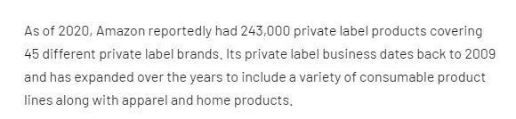 据了解,截至2020年,亚马逊拥有超243000种自有品牌产品,涵盖45个不同的自有品牌。其自有品牌业务可追溯至2009年,多年来已扩展至包括各种消费品产品线以及服装和家居产品。