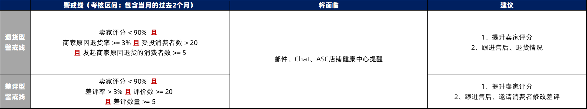平台将从以下三个指标考核店铺维度的商品质量表现:商家原因退货率、差评率、以及卖家评分(各指标的具体定义请参考帮助中心文章),并划分为警戒线和处罚线。