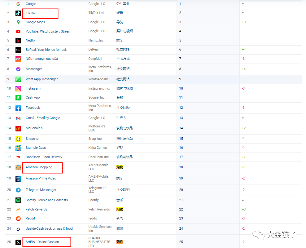 从APP综合排行榜来看,SHEIN的排名还是落后于亚马逊。TIKTOK确实在国外太强势。有问题记得找到大金链子私信咨询!