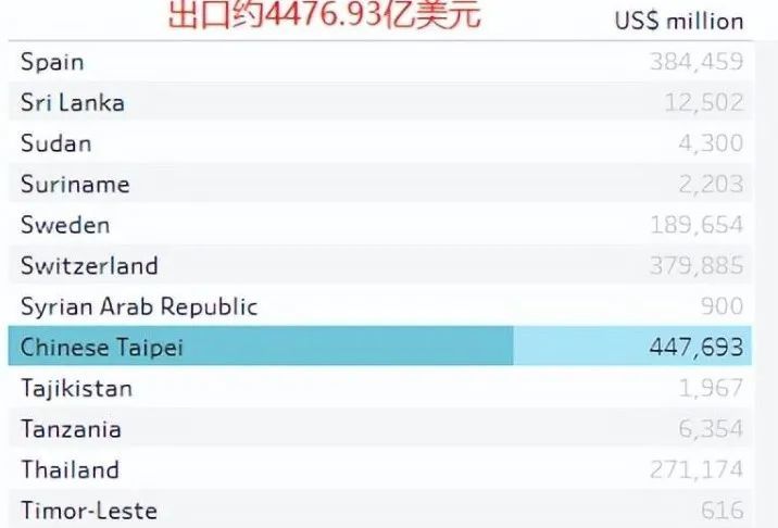 WTO公开的2021年进出口商品数据,台湾的外贸总额为8297.94亿美元,同比增速高达30.6%,其中,出口商品金额约为4476.93亿美元,增长29%;进口商品金额约为3821.01亿美元,增长32.7%——贸易顺差高达655.92亿美元。