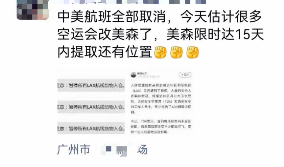 近日,有货代表示,要暂停所有LAX航线货物入仓。另有货代发朋友圈称,中美航班或将全部取消,估计很多空运会改美森。