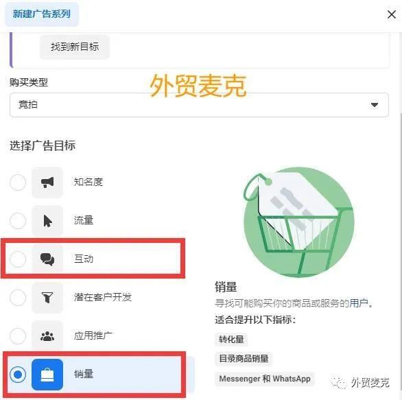 我们做外贸独立站,主要用这2个广告目标:互动和销量, 互动目标可以拿来给广告跑贴文互动,以及刷视频观看,攒自定义受众。