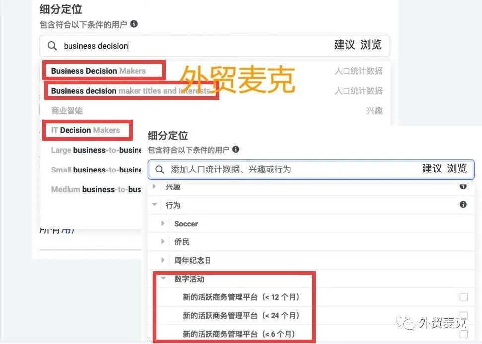前3类,可以用关键词 business decision直接搜到;第4类,在细分定位那里点浏览-行为-数字活动 就能看到这3个定位。