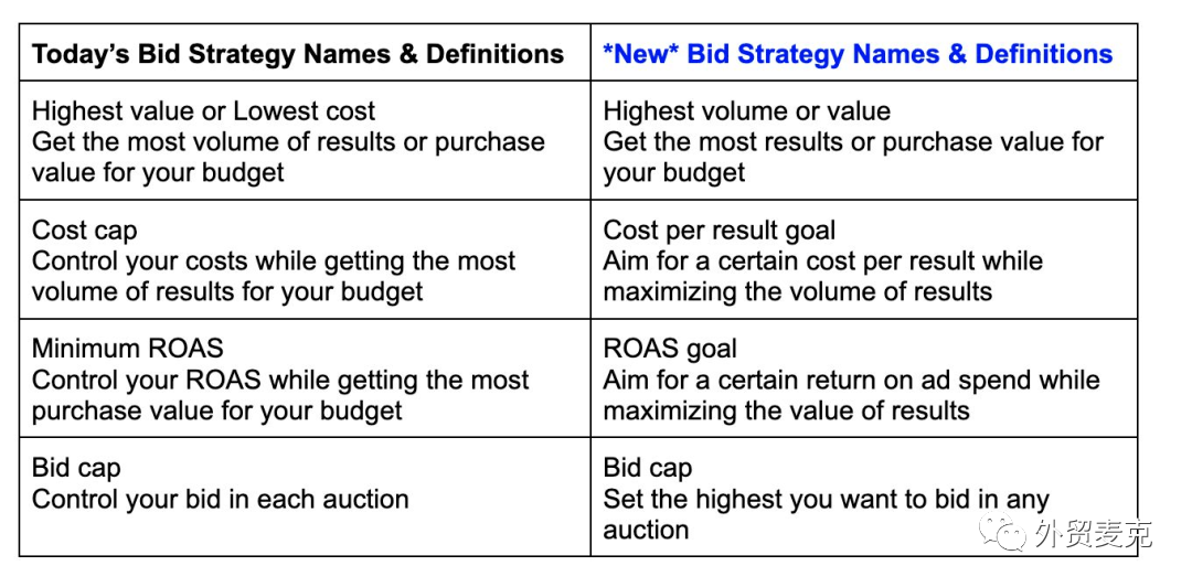 2022年4月4日,Facebook开始在广告管理平台创建流程中,推出广告系列竞价策略的新名称和定义,详细名称和描述更改看这个表格。