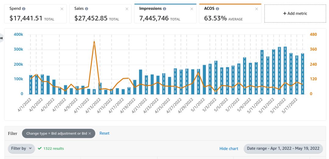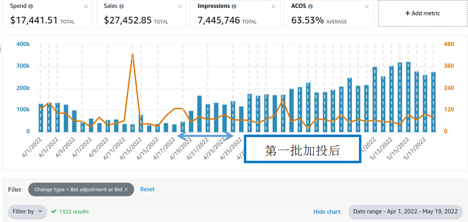 所以4月19日-4月23日的这段区间,我只做预算的重新分配,不加投,不动出价。以下是做增量后的效果: