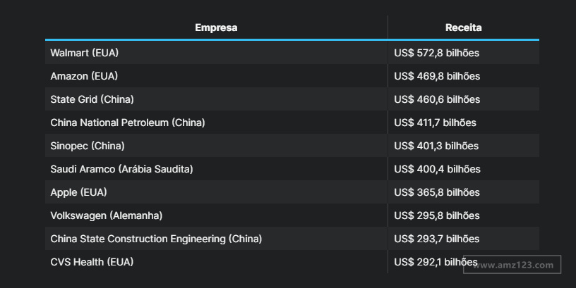 AMZ123了解到,前10名榜单中有4名为中国企业,国家电网、中石油和中石化分别占据第三、第四和第五。中国建筑首次入围前十,位居第九名。