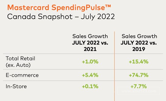 AMZ123获悉,根据万事达卡SpendingPulse的数据,与2021年同期相比,今年7月份加拿大零售总额(不包括汽车)增长了1%,与2019年同期相比,则增长了15.4%。这意味着,虽然当前的通货膨胀水平很高,但是加拿大消费者的支出水平仍然稳定,