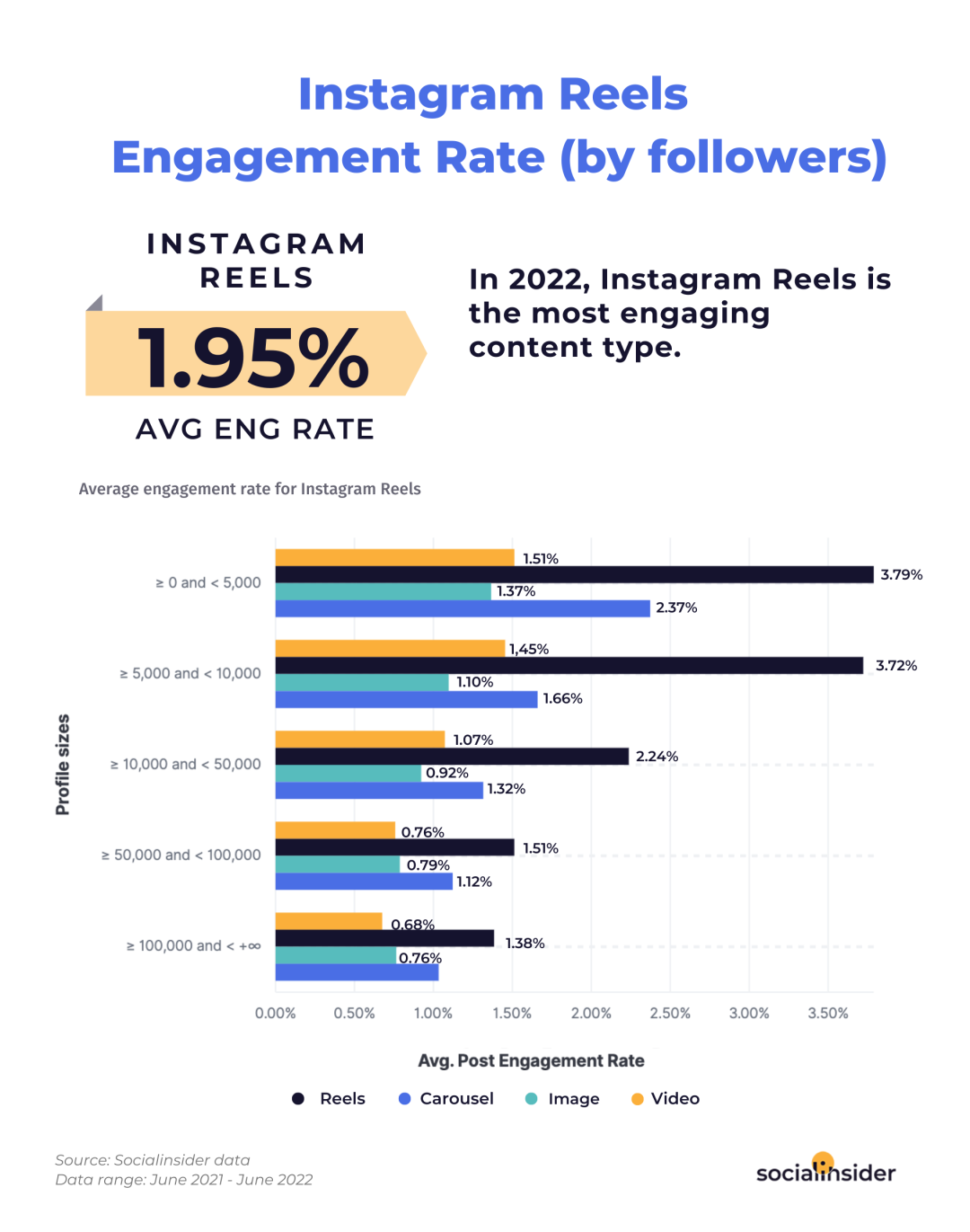 粉丝在5000万以下的账户获得了最高的Instagram Reels参与度——平均高达3.79%