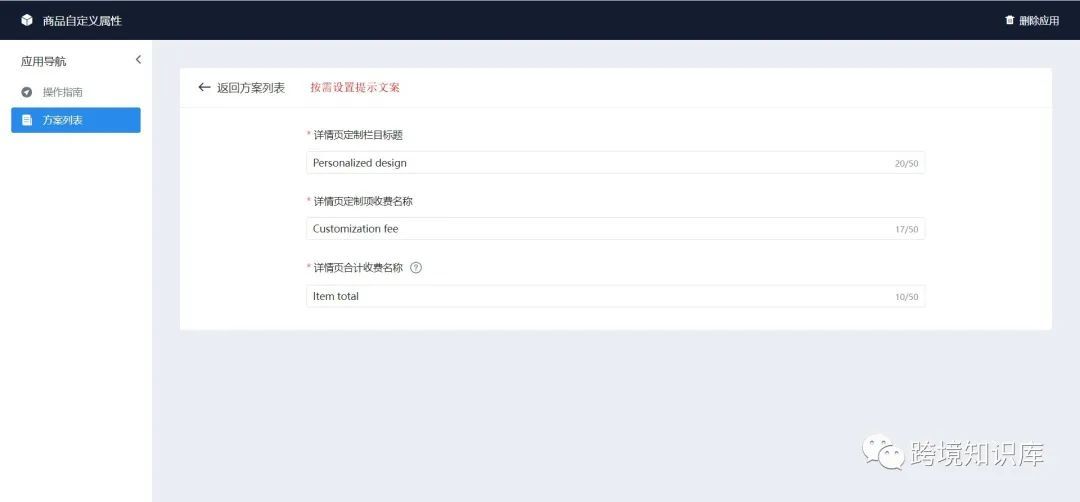 2.按需设置提示文本,包含定制栏目标题、定制项收费名称、合计收费名称
