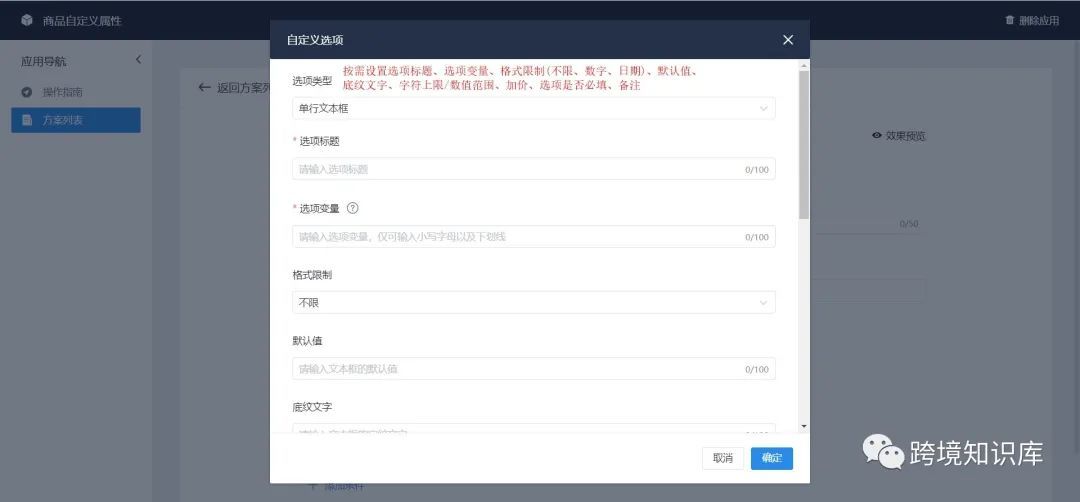 8.【单行文本框】按需设置选项标题、选项变量、格式限制(不限、数字、日期)、默认值、底纹文字、字符上限/数值范围、加价、选项是否必填、备注