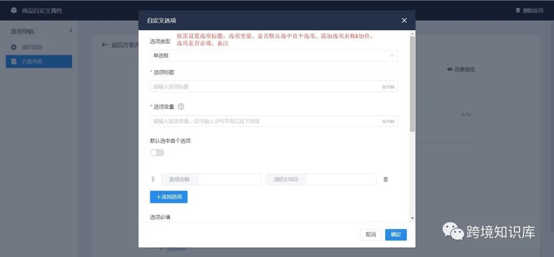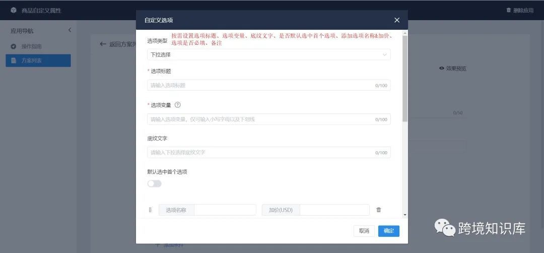 12.【下拉选择】按需设置选项标题、选项变量、底纹文字、是否默认选中首个选项、添加选项名称&加价、选项是否必填、备注