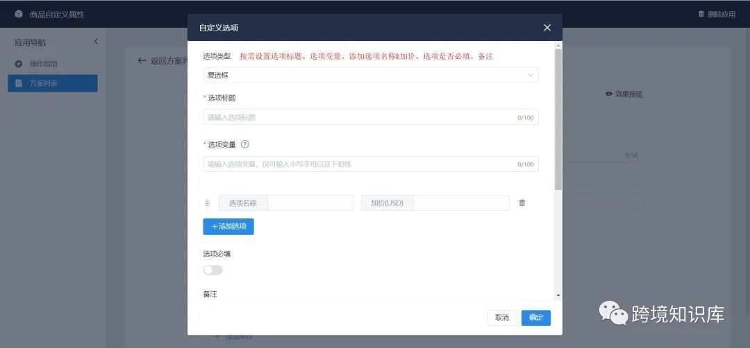 11.【复选框】按需设置选项标题、选项变量、添加选项名称&加价、选项是否必填、备注