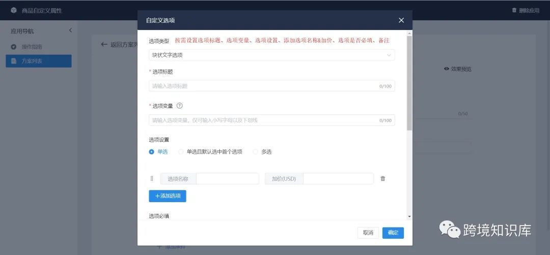13.【块状文字选项】按需设置选项标题、选项变量、选项设置、添加选项名称&加价、选项是否必填、备注