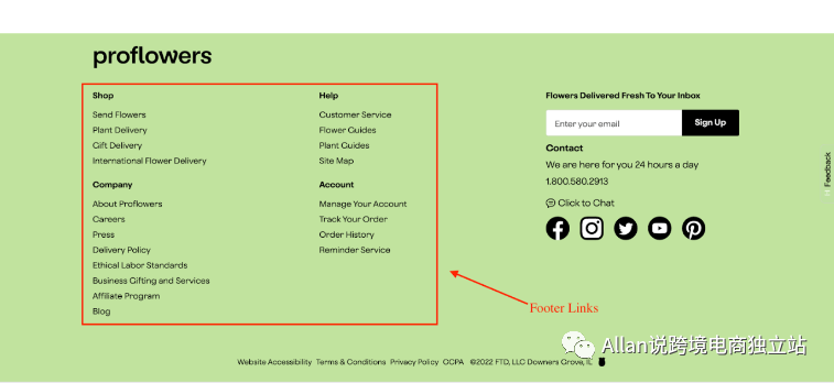 它们应该指向网站上用户可能想要参考的其他重要页面。如果用户在滚动到页面底部时还没有找到他们正在寻找的内容,那么页脚中的内部链接可以帮助他们找到另一个可以点击的地方。