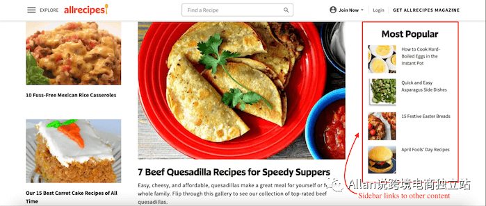 一些网站使用侧边栏中的内部链接将用户引导至热门或相关内容。侧边栏链接对于具有大量内容的网站(如新闻或食谱网站)非常常见,因为用户可能不一定要寻找特定的东西,而只是从一个页面浏览到另一个页面。