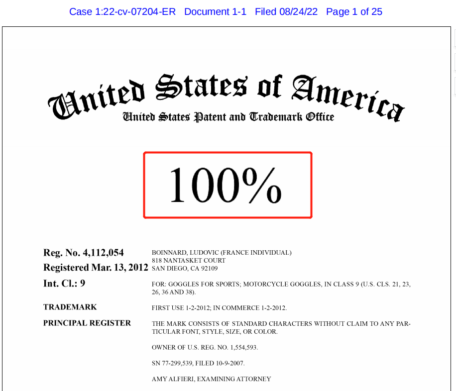 经过一番查证,100%这个商标早在18年就有维权记录,最新的平台起诉案件于22年8月24号发起,案件编号22-cv-7204。