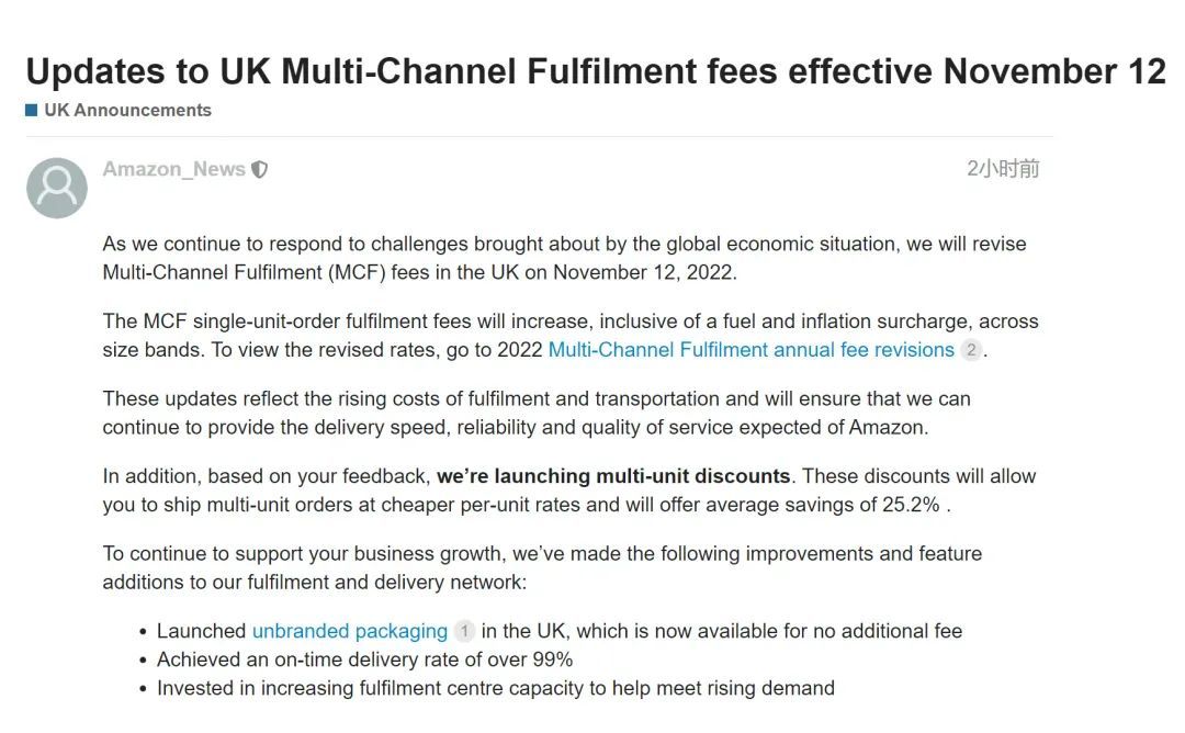 亚马逊发布公告称,为了继续应对全球经济形势带来的挑战,导致燃油费用不断上涨,运输费用、人工成本也不断增加,为了确保商品的配送速度、可靠性和服务质量,亚马逊决定在英国站实行MCF费用上调,能够为商家提供更好的服务。(以下是公告原文截图)