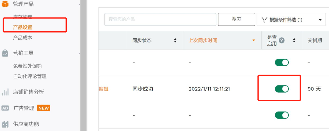 在Jungle Scout导航栏里选择管理产品——产品设置,选择您想要促销的商品,打开激活按钮即可。