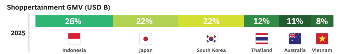 TikTok&BCG 的报告预测,到 2025 年,"娱乐购物"趋势将为亚太地区带来 1 万亿美元的市场机会。其中,印度尼西亚、日本和韩国将贡献总价值的 67%。