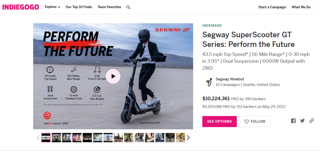 今天小编就挑了我们打造过众多百万美金案例里大家熟知的一个品牌——Segway Ninebot 九号,来为大家解答,最低档位2799美金/最高档位3999美金的越野电动滑板车是如何问鼎百万美金的呢?小编对本期案例会进行深度的运营剖析,分别从Segway众筹项目背景及成果、执行的核心难点与策略解决,以及上线后购买热度下降如何持续销售热度三个角度来给大家解答。