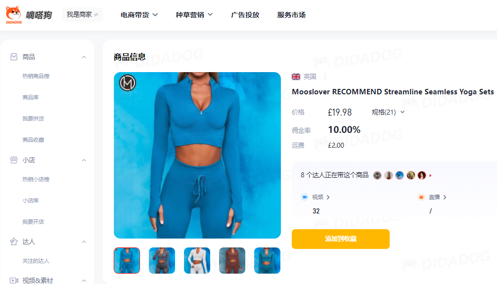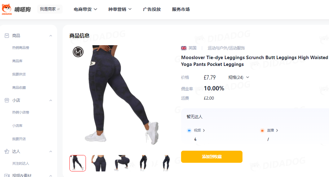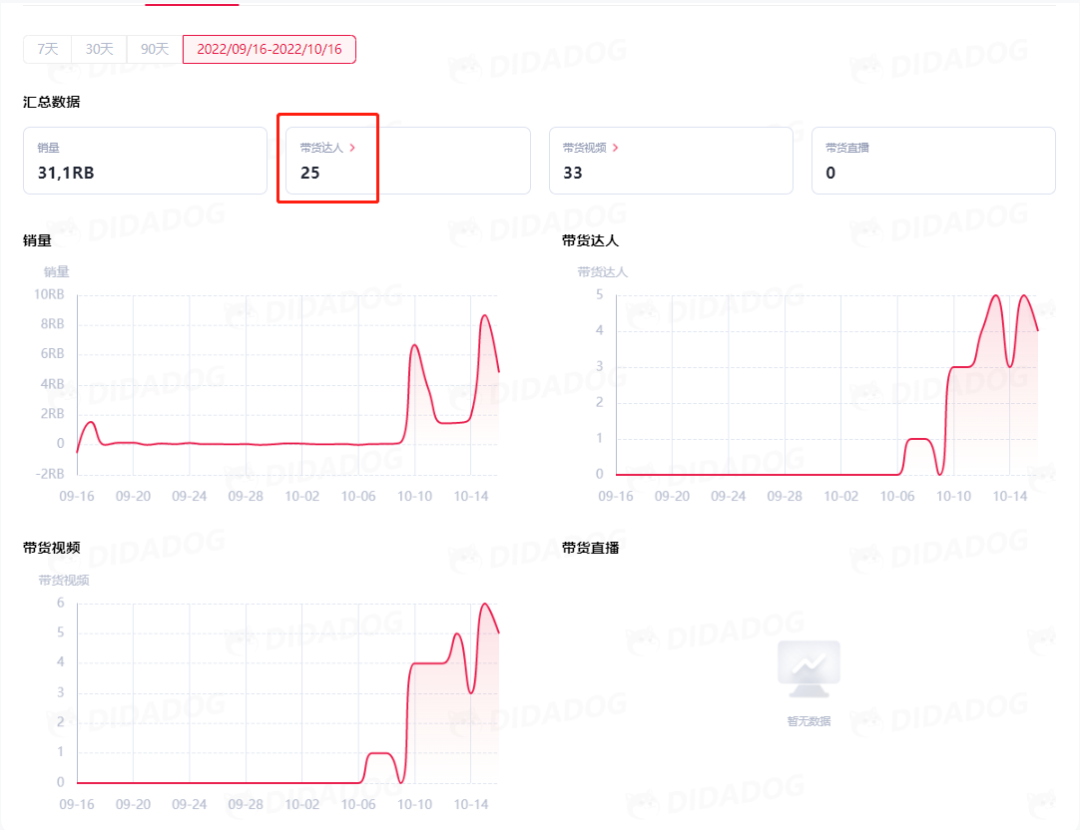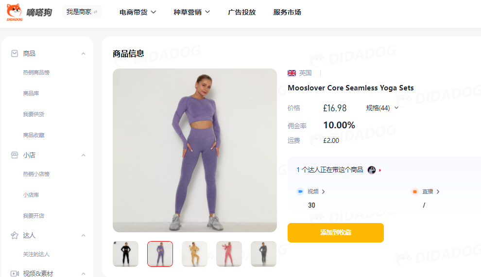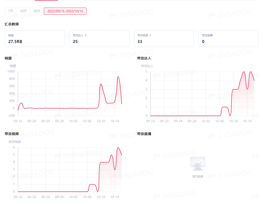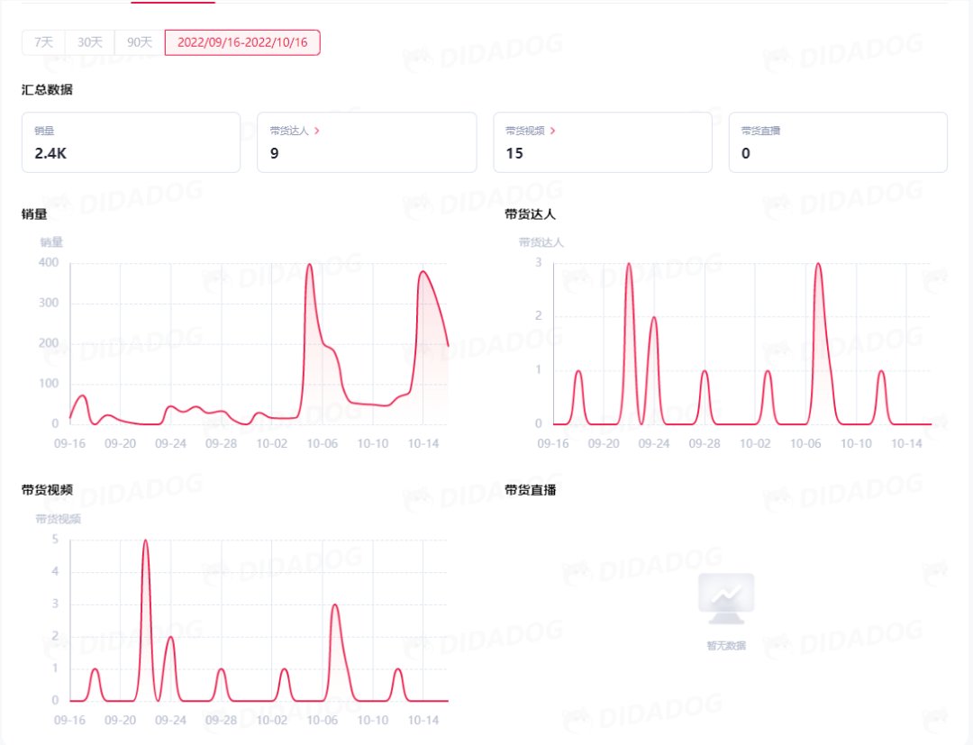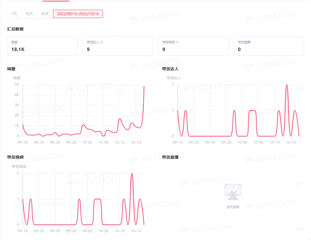 通过嘀嗒狗数据可发现这款瑜伽套装在过去的一个月销量较不可观,10-5销量直线上升,出现了本月第一个销售高峰,后续销量短暂下降后在10-14在次达到销量顶峰。