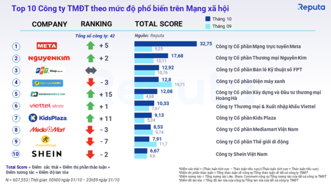 据 Reputa 发布的 2022 年 10 月越南社交网络最受欢迎的电商公司报告显示,来自中国的快时尚品牌 Shein Vietnam(Shein 越南公司)首次进入前十。