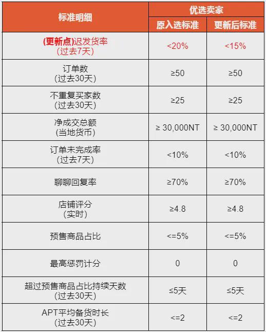 Shopee台湾跨境店将于6月24日更新优选卖家标准,更新标准如下: