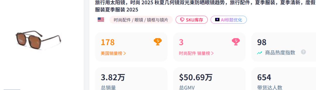 近期,TikTok美国站时尚配件类目掀起"太阳镜热潮",热销榜TOP 10中竟有3款不同风格的太阳镜强势登榜。其中,一款几何框设计太阳镜表现尤为亮眼,直接拿下"销量王&q