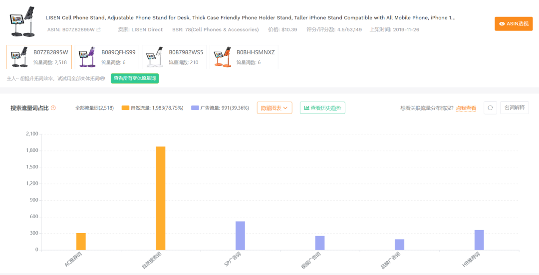 ASIN B07Z82895W 在关键词 phone stand 下,就出现在了 自然搜索+广告混合的 6 个版块。