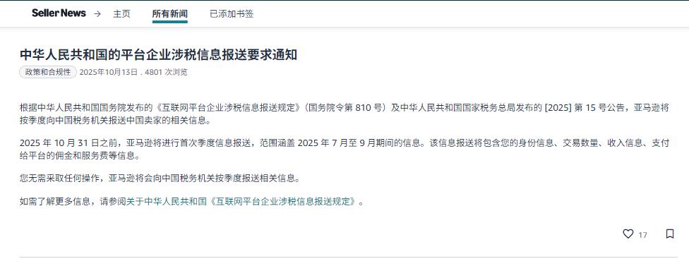 近日,亚马逊发布公告称,依据《中华人民共和国〈互联网平台企业涉税信息报送规定〉》(国务院令第810号)及国家税务总局相关要求,亚马逊将按季度向中国税务机关报送中国卖家的相关涉税信息,包括身份信息、交易