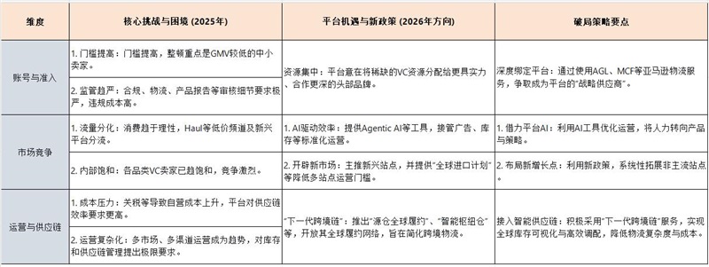 为了让你快速了解现状与方向,我将2026年亚马逊VC面临的挑战、机遇及相应的破局策略,汇总为下表: