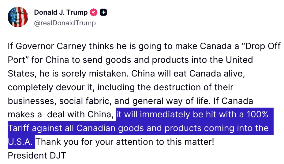 当地时间1月24日,特朗普公开威胁,若加拿大继续推进与中国的贸易协议,美国将对所有加拿大输美商品征收100%关税。