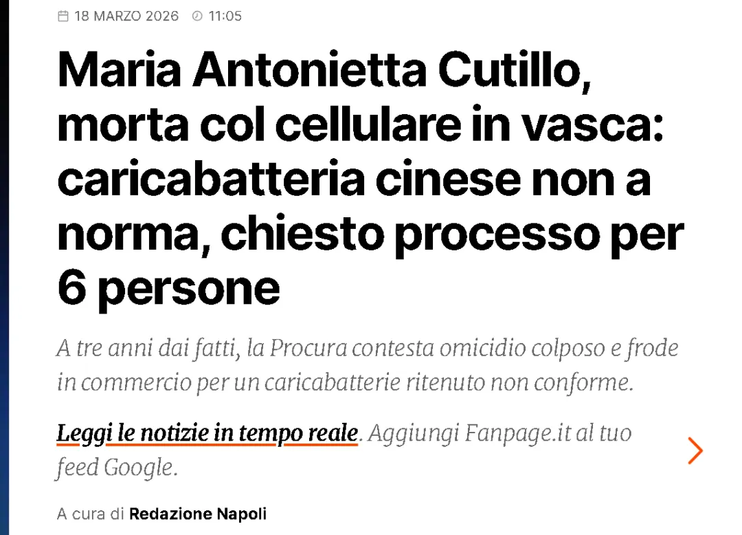 致命的劣质充电器这场悲剧发生在2023年5月,意大利一名15岁少女在浴室洗澡时,边充电边使用手机,不料充电器滑落水中,瞬间引发致命漏电,女孩当场不幸身亡。时隔近三年,意大利检方全链条调查结果公布:涉事充电器,是一款从中国进口、贴着伪造欧盟CE安全认证标志的三无劣质产品。正常来说,合格充电器具备强绝缘与安全保护,落水可避免高压外泄,大幅降低致命风险;而经实验室检测,这款充电器内部采用劣质元器件,绝缘层完全失效,连最基础的用电安全防护都不具备;同时产品无正规使用说明书、无安全警示语、无官方合规声明,完全不符合欧盟电子产品准入标准。而该产品的进口与销售方,3名中国籍跨境卖家,已被检方以共同过失杀人、商业欺诈、销售伪劣商品三项罪名提起公诉,案件将于2026年6月开庭审理。
