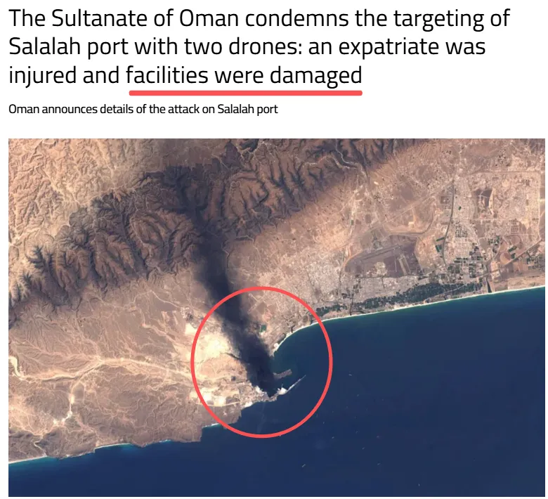 据阿曼官方通讯社通报,本次袭击由两架无人机发起。事件造成一名外籍工作人员受伤,港口一台岸桥起重机出现轻度损毁。虽然整体破坏范围有限,但港区第一时间启动应急预案,全面停工并疏散现场人员,严控安全风险。