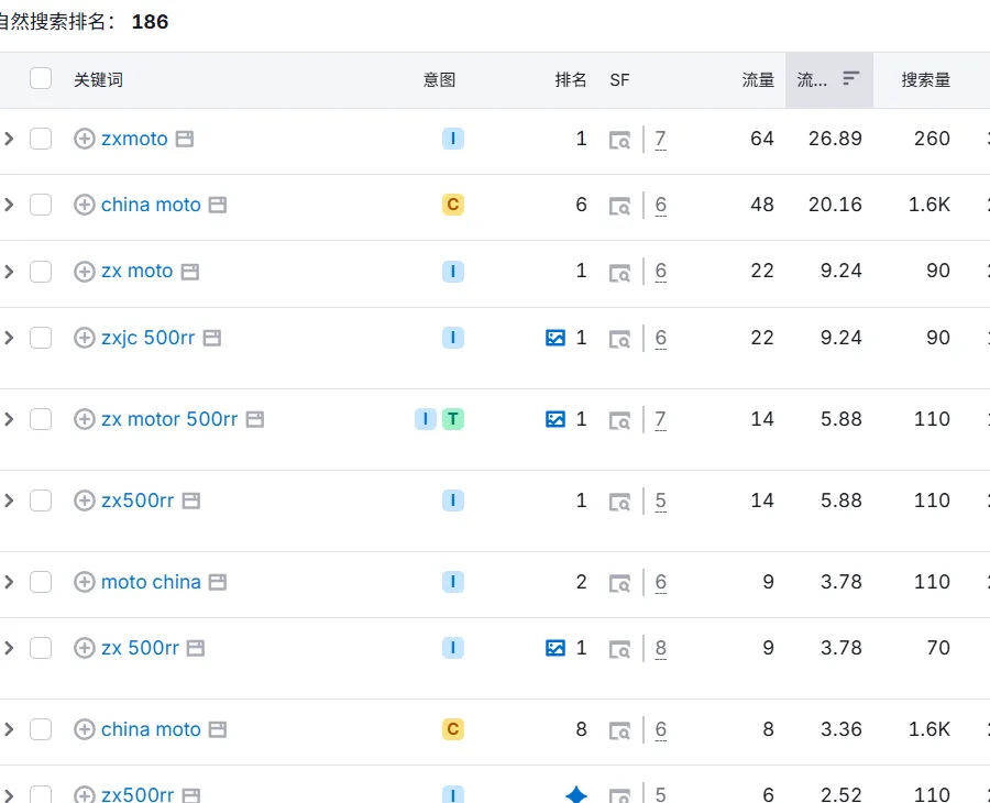 从截图数据可见,zxmoto、zx500rr 等品牌核心词包揽排名前列,其中zxmoto以排名第 1、流量 64、搜索量 260 的表现,成为全站流量最高的关键词。这类关键词并非泛行业词,而是用户对品牌的直接认知,属于典型的导航意图搜索 —— 用户要么记不住域名,要么认准了 zxmoto 的品牌,直接搜索品牌名找产品,这正是养鱼模式的核心流量来源。